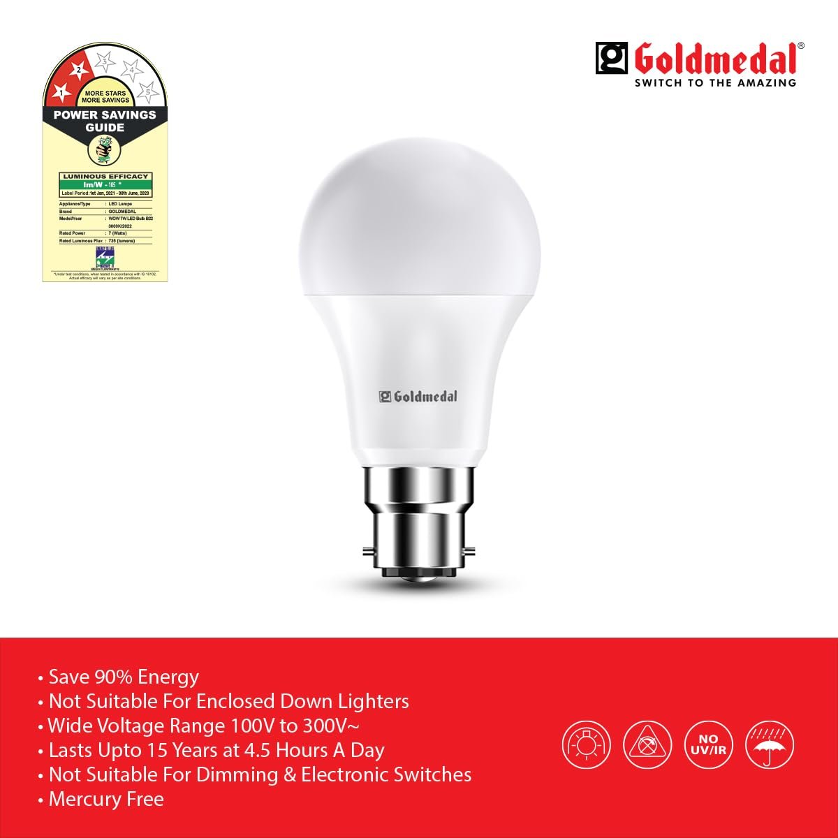 The Goldmedal WOW B22 LED Bulb is an eco-friendly and energy-efficient lighting solution that saves up to 90% energy compared to traditional bulbs. Built with a wide voltage range of 100V–300V and surge protection up to 4kV, it ensures reliable performance even during voltage fluctuations. With a lifespan of up to 10 years (based on 4.5 hours daily use), this LED bulb is durable, mercury-free, and safe for everyday use. Backed by a 1-Year Manufacturer Guarantee, it’s a reliable choice for homes, offices, and commercial spaces.