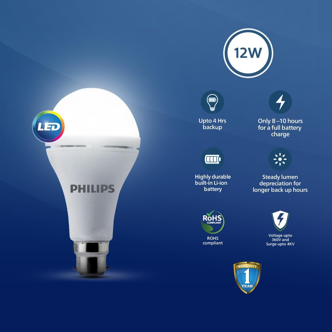 Experience uninterrupted brightness even during power cuts with the Philips 12W Emergency Inverter LED Bulb. Designed with a built-in rechargeable Li-ion battery, this smart LED bulb automatically switches to emergency mode when the power goes out — giving you up to 4 hours of backup light.